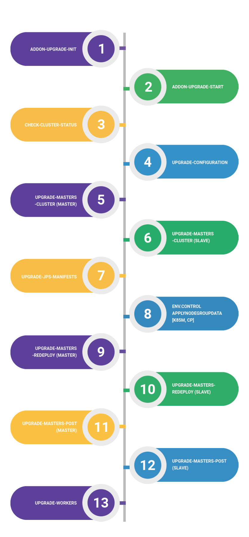 The upgrade process begins with upgrading the master node, which serves as the control plane. Subsequently, the worker nodes are upgraded. The sequence of upgrade actions aligns with the directives specified in the package manifest.