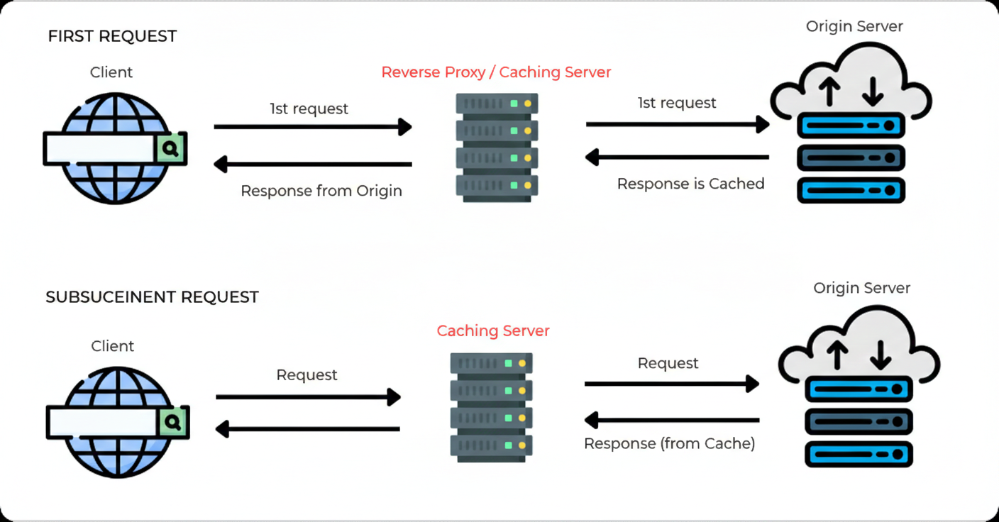Stores generated responses or database queries on the web server using tools like Redis, Memcached, or file cache.