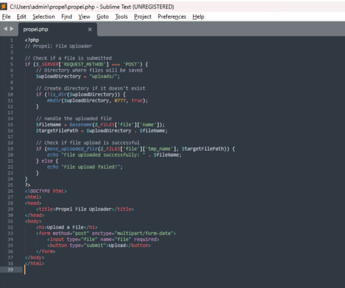 Decide what Propel will do (e.g., manage files, process data, handle forms, etc.). For this example, let’s create a basic file uploader program. - Write the PHP Code: