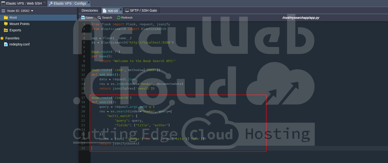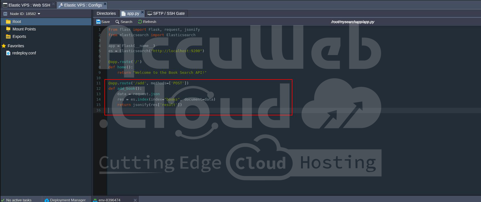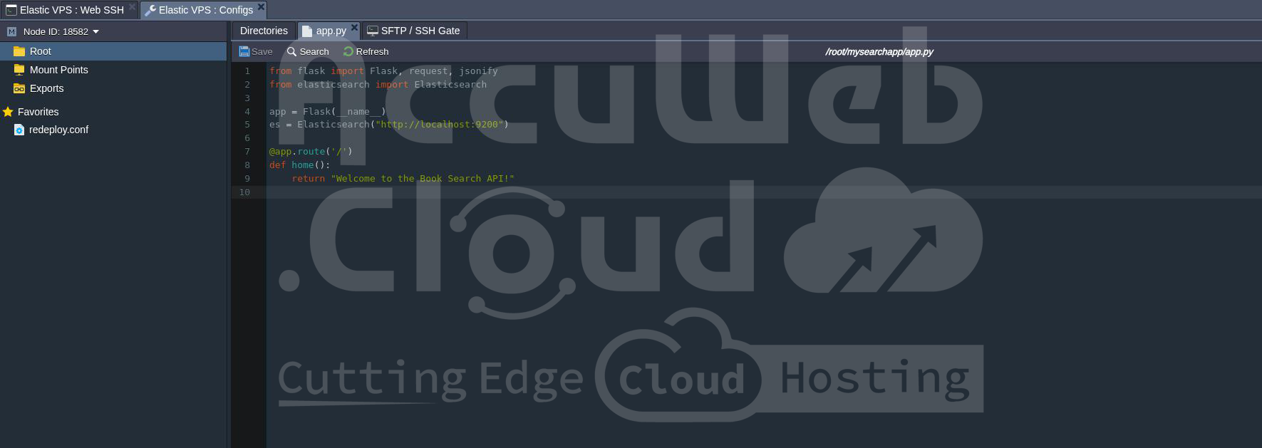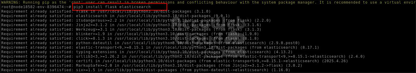 This sets up Flask (a lightweight web framework) and the official Python client for Elastic Search.