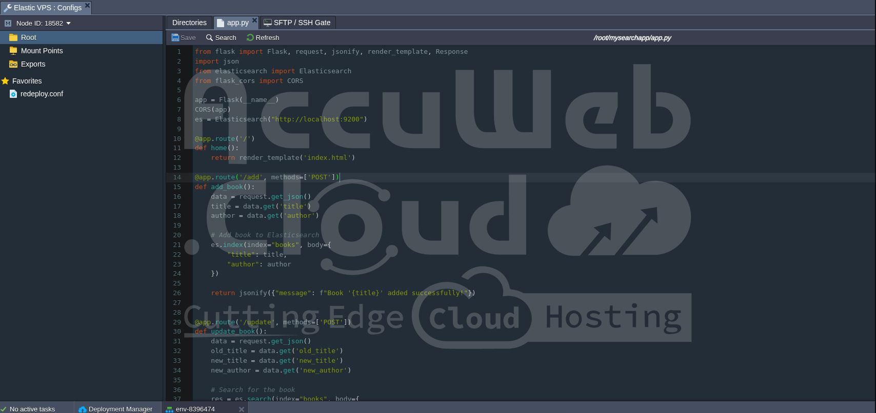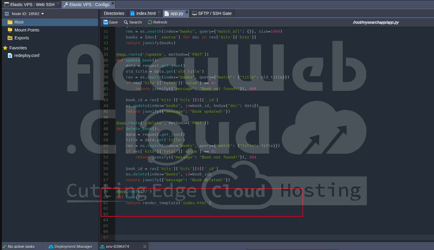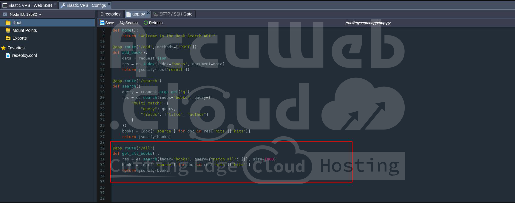 This sets up Flask (a lightweight web framework) and the official Python client for Elastic Search.