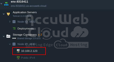 1. Via the email notification sent to you after environment creation. Look for the container admin data section in the email. The container’s domain name is provided in the Access URL string, while its internal IP address is listed under the IP line.