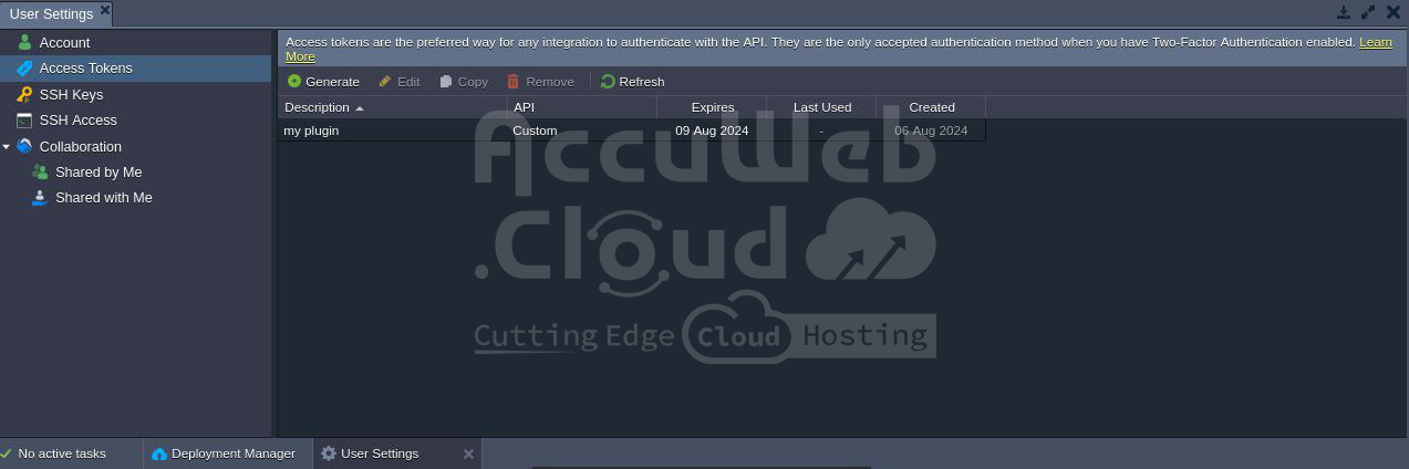 Step 2. In the Access Tokens tab, you can create and manage personal access tokens for your account.