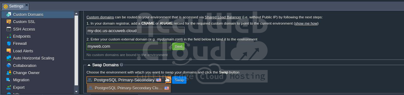 Step 1. Select Custom Domains to access the following sub-options: Domain Binding and Swap Domains.