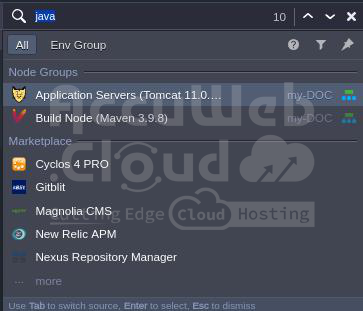 The platform includes a built-in search feature within the dashboard. To use it, access the Search form at the top-right corner (or use the Ctrl+F/Cmd+F shortcut), enter your search terms, and press Enter. For instance, you can locate a container by its IP/ID, search for a specific deployed project or environment, or find and deploy applications from the platform Marketplace.