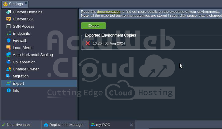 Select Export to package all your environment’s settings and data into a single downloadable file. This file can then be restored on another hosting provider’s platform, creating an identical copy of the environment.