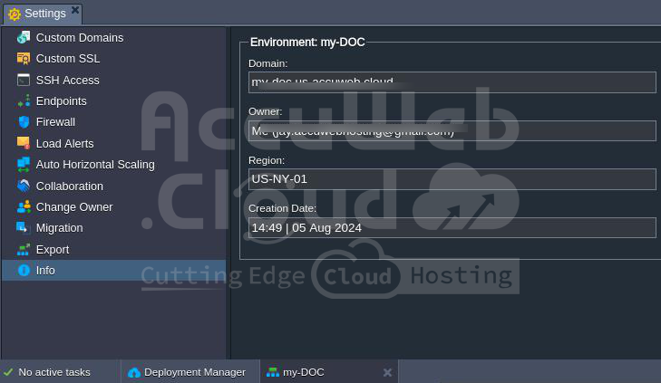 Step 12. Switch to the Info section to view additional details about the environment, including the domain, owner, and creator (which may differ due to the account collaboration feature), region, and creation date.