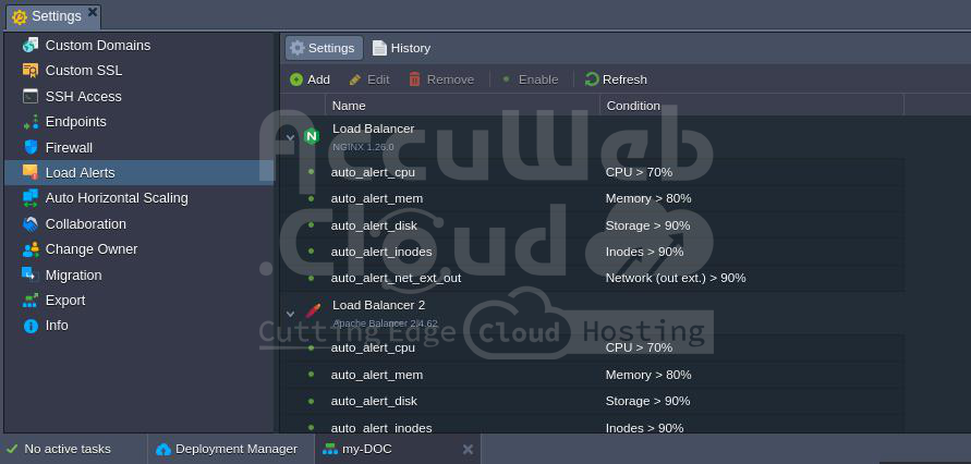 Step 6. Use Load Alerts to set new triggers or adjust the default ones to receive email notifications when the specified resource usage exceeds the defined limits.