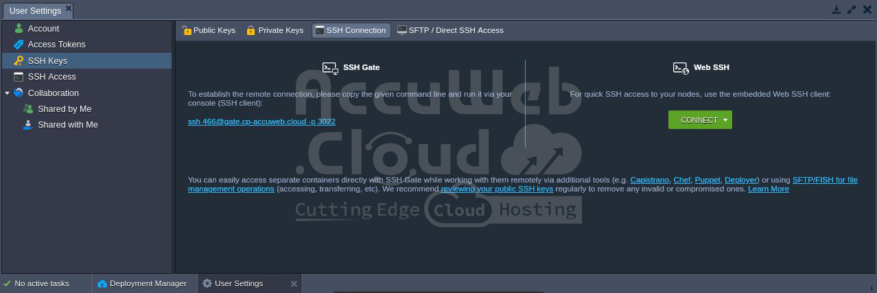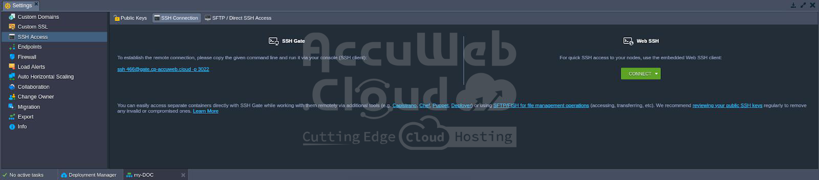 Step 3. In the SSH Access section, you will find the following tabs: Public Keys, SSH Connection, and SFTP / Direct SSH Access. The Public Keys tab allows you to manage your public SSH keys. The SSH Connection tab provides instructions for accessing your environment via SSH Gate or Web SSH. The SFTP/Direct SSH Access tab offers details on connecting using SFTP or FISH protocols.