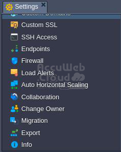 The Environment Settings tab offers twelve options: Custom Domains, Custom SSL, SSH Access, Endpoints, Firewall, Load Alerts, Auto Horizontal Scaling, Collaboration, Change Owner, Migration, Export, and Info.