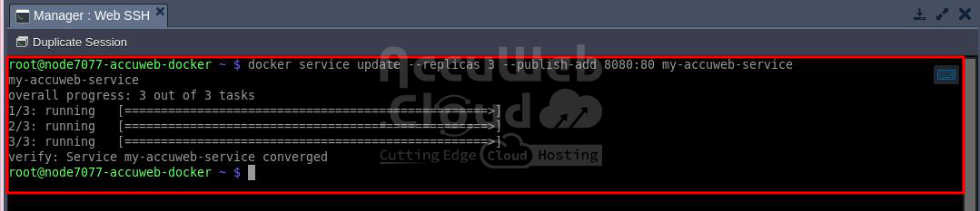 Example: docker service update –replicas 3 –publish-add 8080:80 my-accuweb-service