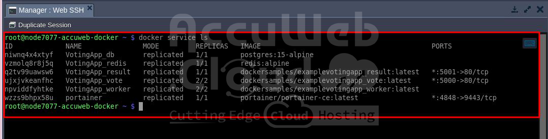 This method provides extra reliability with automatic failover protection and workload distribution when hosting your services in a Docker Swarm cluster. The Docker Swarm solution, pre-packaged by AccuWeb.Cloud for one-click installation, offers these benefits in just minutes.