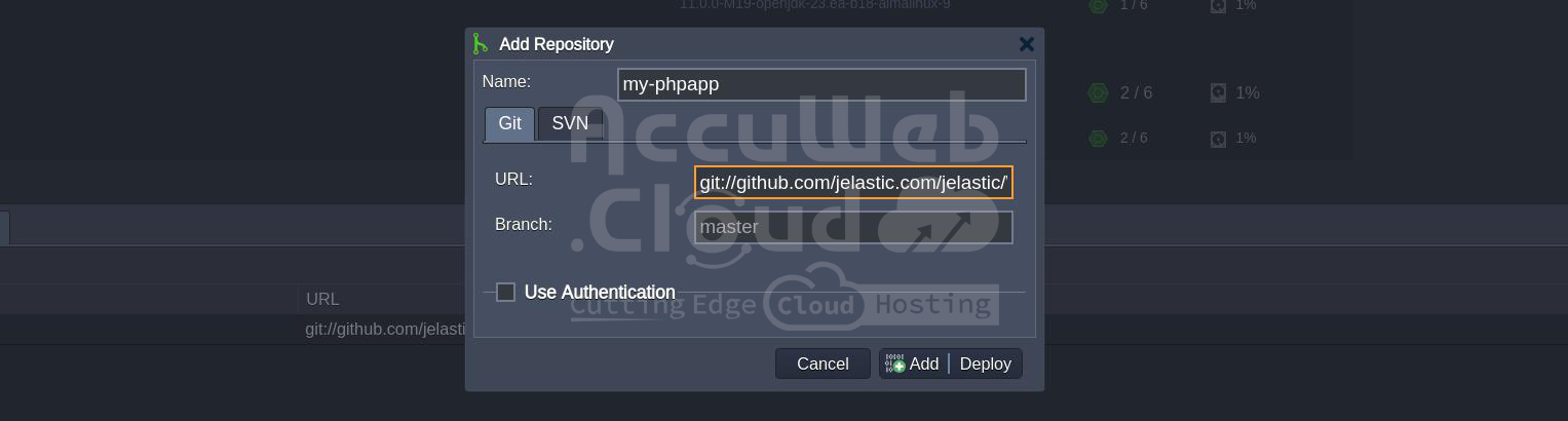 - Optionally, check the “Use Authentication” box and provide either a Password, Token or SSH Key for credentials.