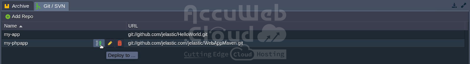 3. To access the choices for deploying, editing, or deleting the Git / SVN project in the Deployment Manager, hover over it.