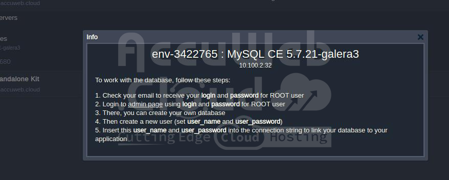 Step 6. To access the administrator panel for the MySQL node of the master-MySQL-1 environment, run the same lines but replace the parameter values with the information of the second DB server.