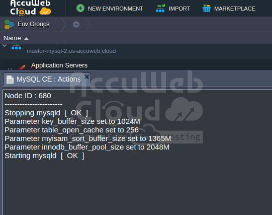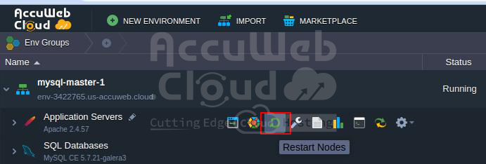 Steps 3. After making changes to the /etc/my.cnf file, save the modifications and restart the MySQL node in the master-mysql-1 environment. To confirm that the restart was successful, simply go to the actions tab that automatically opens up.