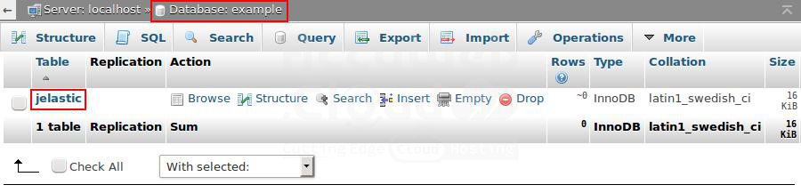 Steps 4. Please switch back to the admin panel of the first MySQL server and verify that the replicated example database now includes the “Jelastic” table.