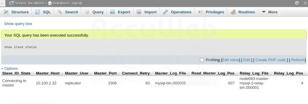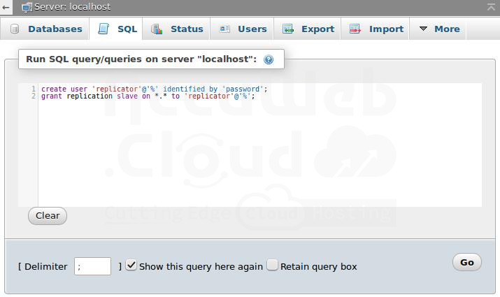 To do this, open the SQL tab located in the phpMyAdmin panel of the second MySQL server (which is included in the master-mysql-2 environment) and execute the following command: