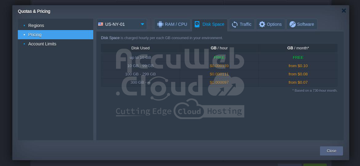 Disk space is charged hourly per GB consumed in your environment. We are providing FREE disk space up to 10GB/hour, and after 10 GB, there will be specified charges based on 730 hours per month.