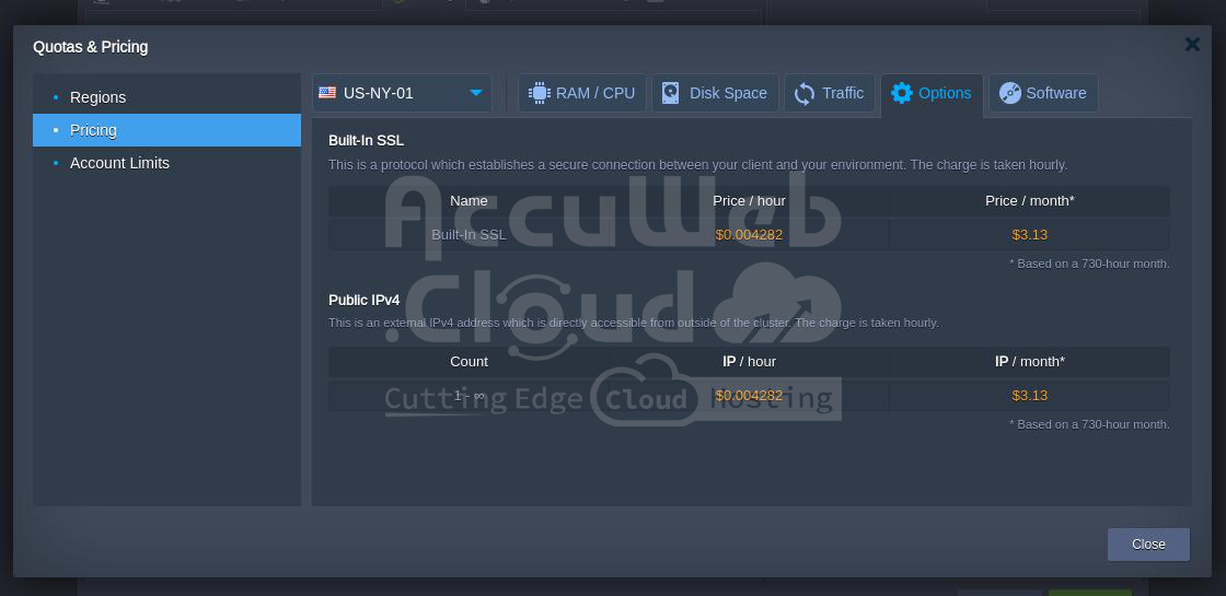 - Dynamic Cloudlet: “Total – IPv4 – Builtin SSL = discountable amount – 1% (Discount) = final payable amount” (hourly)