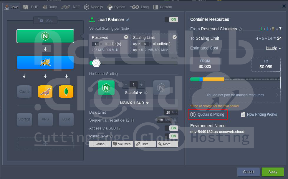 In any given environment, you will be charged only for the specific resources you use. The load balancer, application server, and database all have their pricing based on usage. The prices for CPU, RAM, traffic, disk space, and software are already determined, and you can check the specific costs for each.