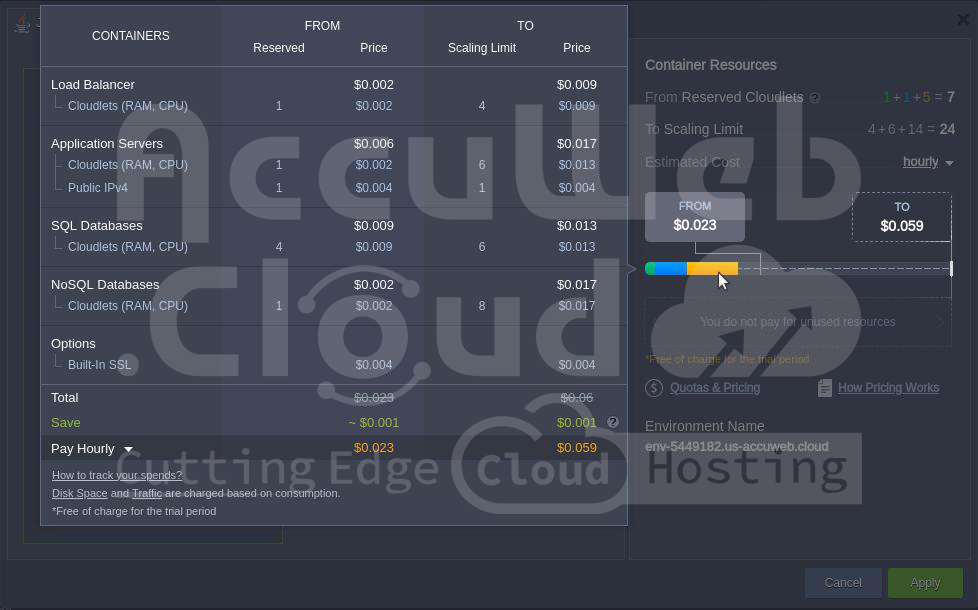 AccuWeb.Cloud provides a detailed pricing structure that describes the estimated total cost of the container’s reserve and scaling limit.