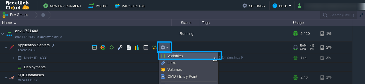 Step 2: Click on the setting located beside the application server and click on the variable.