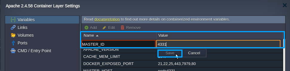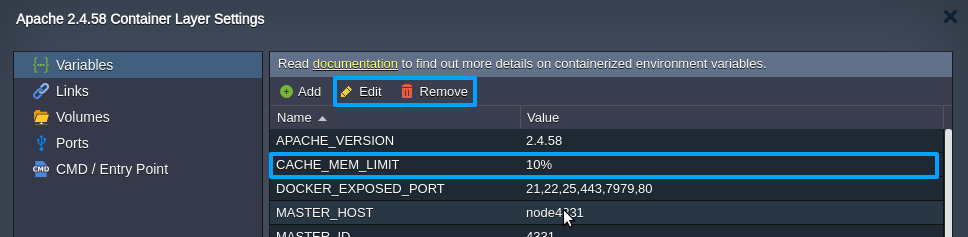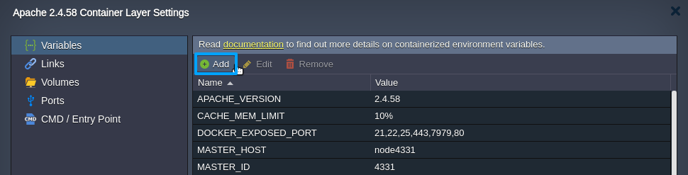 If container linking is in effect, variables originating from other nodes within the environment will also appear in this tab, distinguished by a unique prefix. Furthermore, you can edit these variables on the fly, with changes being automatically propagated to all associated source and target containers.