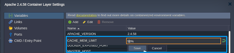 LLSMP DB_MEM_LIMIT + Defines the portion of RAM, which should be reserved for the built-in MariaDB database server, 40% of container total RAM by default.