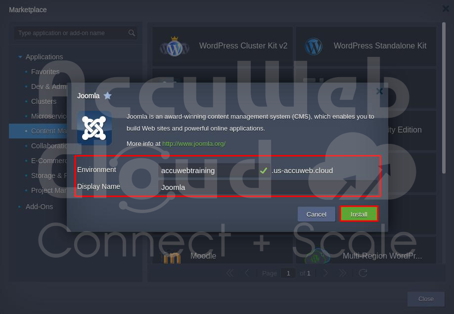 Step 5. In the opened installation window, go to the Environment field and enter the name you want to use to browse the Joomla site. Here, we have entered accuwebtraining as an example. In the Display name, enter the name you want to display in the AccuWeb.Cloud environment.