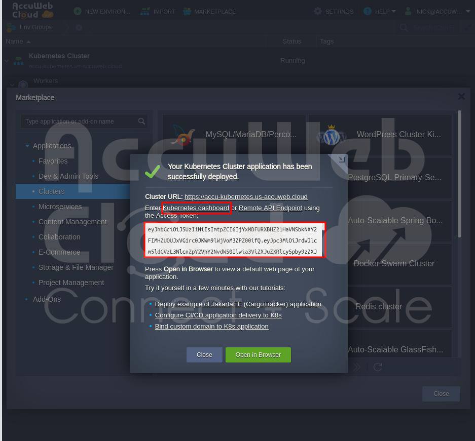 Step 3: In the Marketplace, go to “Application” and click on “Clusters,” then choose “Kubernetes Cluster.”