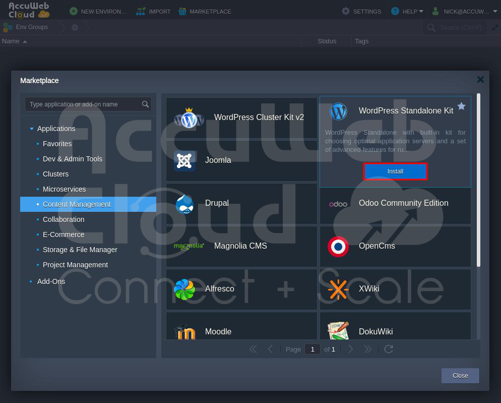 Step 3. Go to the Application in the Marketplace window and click on Content Management. After that, go to the WordPress Standalone Kit option.