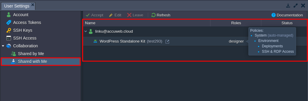To see your roles for a specific shared environment, go to Settings > Collaboration.