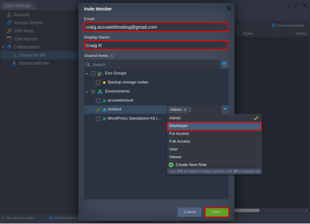 - Shared Items – Select the items and categories (like environments and groups) you want to share with the member. You can change their roles or create a new role.