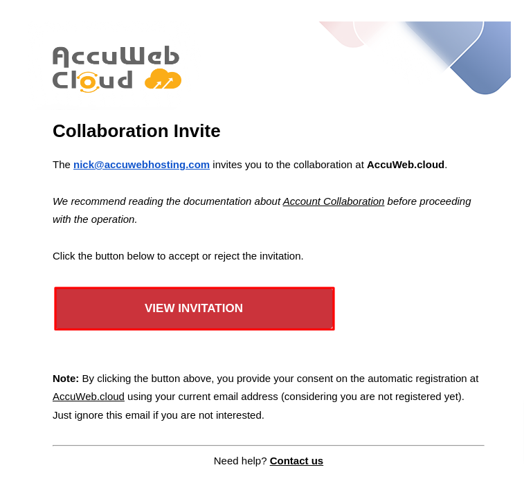 To create your collaboration, you just need an AccuWeb.Cloud account. This account can invite other customers or users to collaborate with you. You can manage most collaboration tasks in a specific section of your account settings.