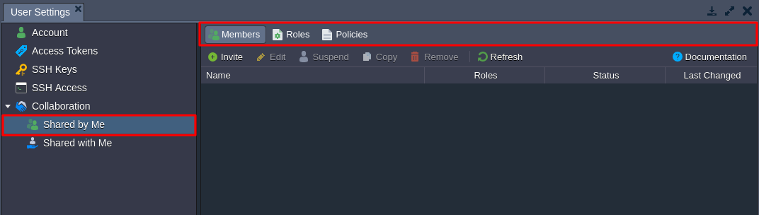 - Members – You can manage the list of collaboration members. This includes inviting new users, suspending or removing existing ones, and customizing shared environments and groups.