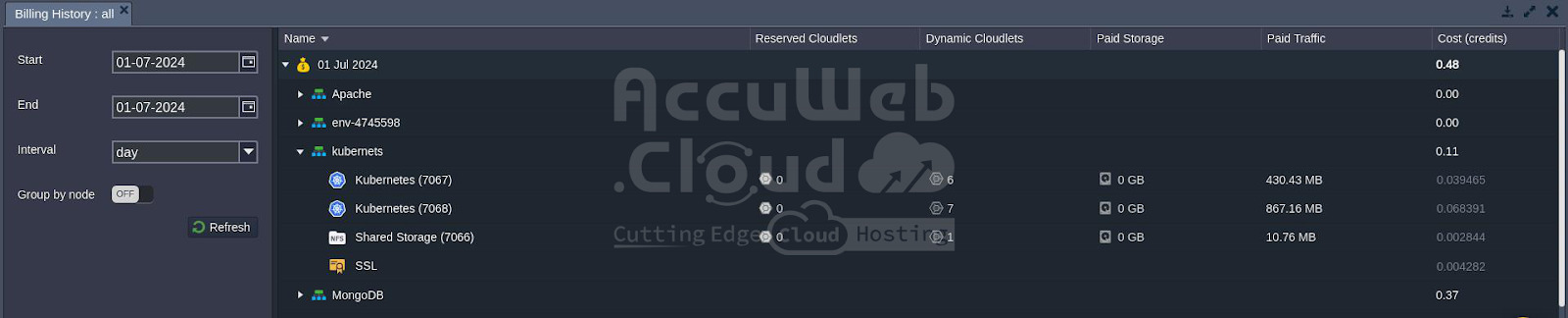 The billing process is transparent and can be tracked through the dashboard under Balance > Billing History. The price is based on the number of consumed resource units, called cloudlets (128MiB + 400MHz). This granularity provides flexibility in billing and clarity in cloud expenditures.