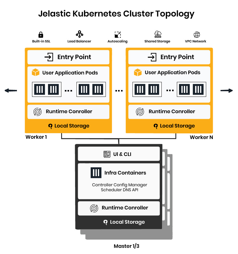- Fast automatic or manual horizontal scaling of Kubernetes worker nodes is facilitated with integrated autodiscovery.