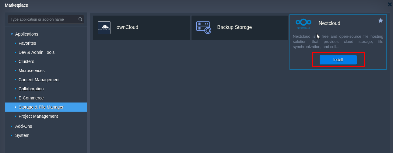 From the dashboard, navigate to Marketplace, search for Nextcloud, and select the application.