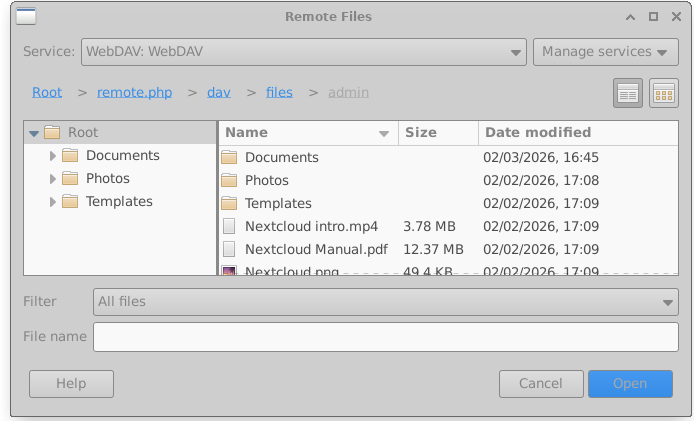 This integration uses WebDAV, allowing LibreOffice to treat Nextcloud as a remote drive.