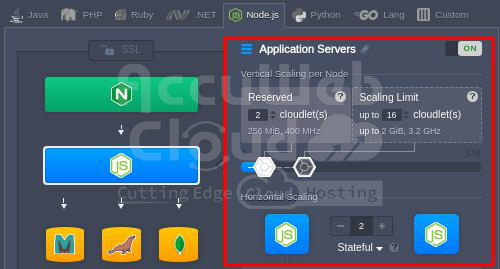 Simply set the maximum number of cloudlets (each cloudlet equals 128 MiB of RAM and 200MHz of CPU) for your NodeJS application server, and the platform takes care of the rest.