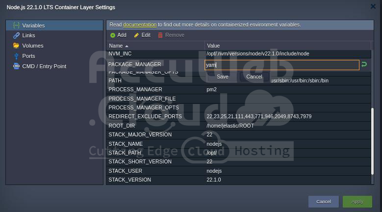 By default, NodeJS uses the npm package manager, but you can switch to yarn if needed. To do this, go to the container variables frame and set the PACKAGE_MANAGER value to either npm or yarn.