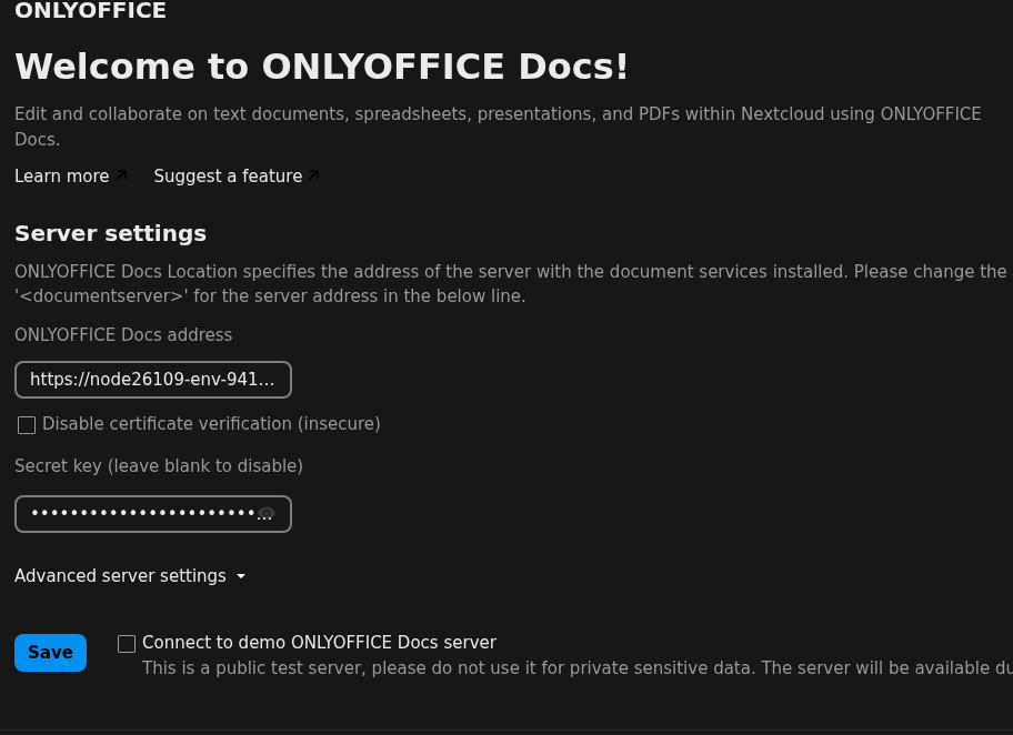 In order to integrate Onlyoffice server with Nextcloud, you will need: