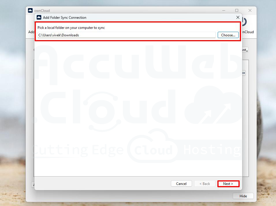 Step 2: Enter the OwnCloud URL in the Address box and click on the Next button.
