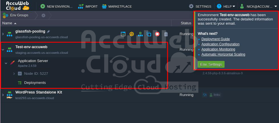 4. Then, use the curl function to connect to your AccuWeb.Cloud account through API and create the environment.