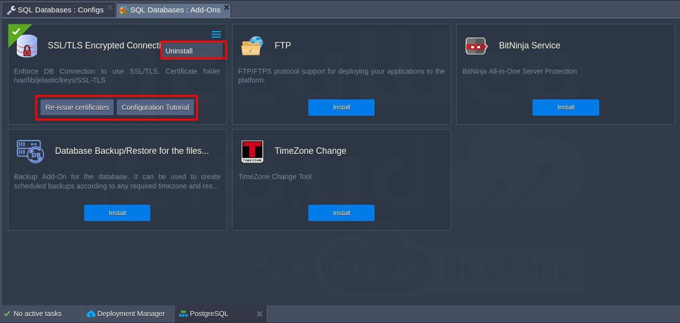 After installation, find the PostgreSQL SSL addon under the Add Ons tab in the appropriate layer(s). Here are the key configuration options: