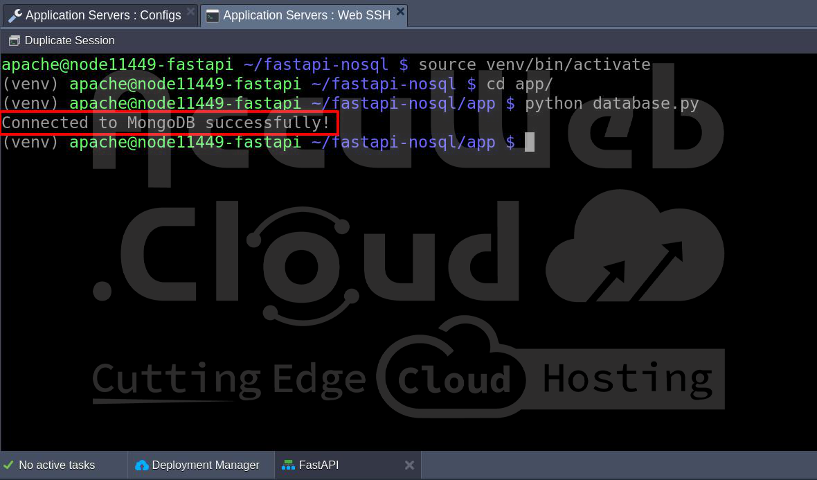 This workflow ensures that your Python application can securely communicate with the MongoDB instance hosted on AccuWeb.Cloud. By activating the virtual environment, and running the connection script, your setup is verified and ready for further development.