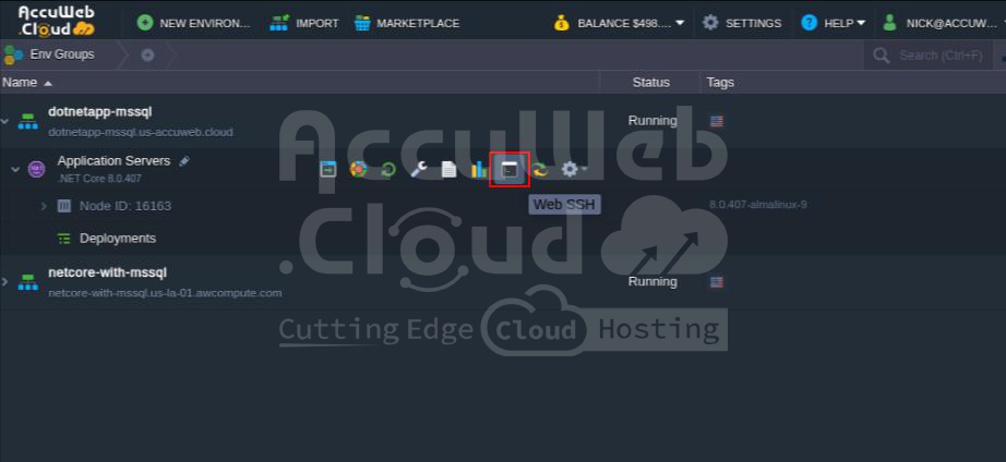 Open the environment where you installed .NET Core. Click Web SSH next to the Application Server.