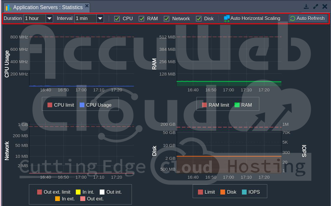 The limits for RAM and CPU depend on how many cloudlets you have. You can set the disk amount within certain limits, and the limits for network and IOPS are set by your hosting provider. Also, know that the network limit is not about how much you use in total, but how much you use per second (Mbps) externally.