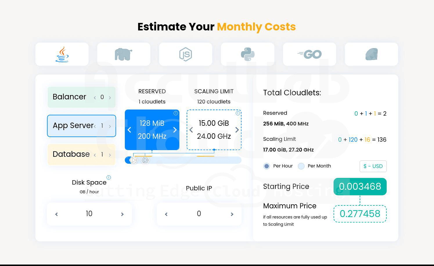 Our cloud hosting cost estimator is a helpful tool for estimating your expenses. You can get an approximate cost of cloud hosting for your project or service by inputting relevant information.